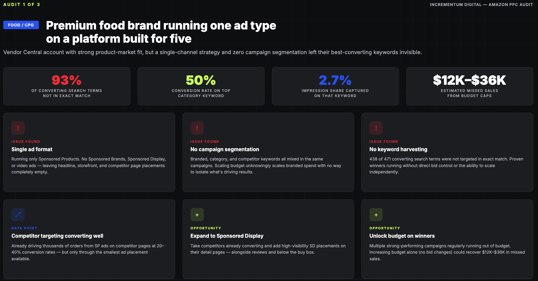 Audit 1: A food brand spending only on Sponsored Products — and leaving its best keywords starved