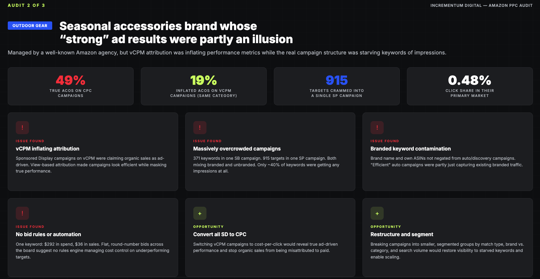 Here are three real Amazon advertising audits we conducted recently. Anonymized, but otherwise exactly what we found. If any of this looks familiar, there’s a good chance the same dynamics are playing out in your account.