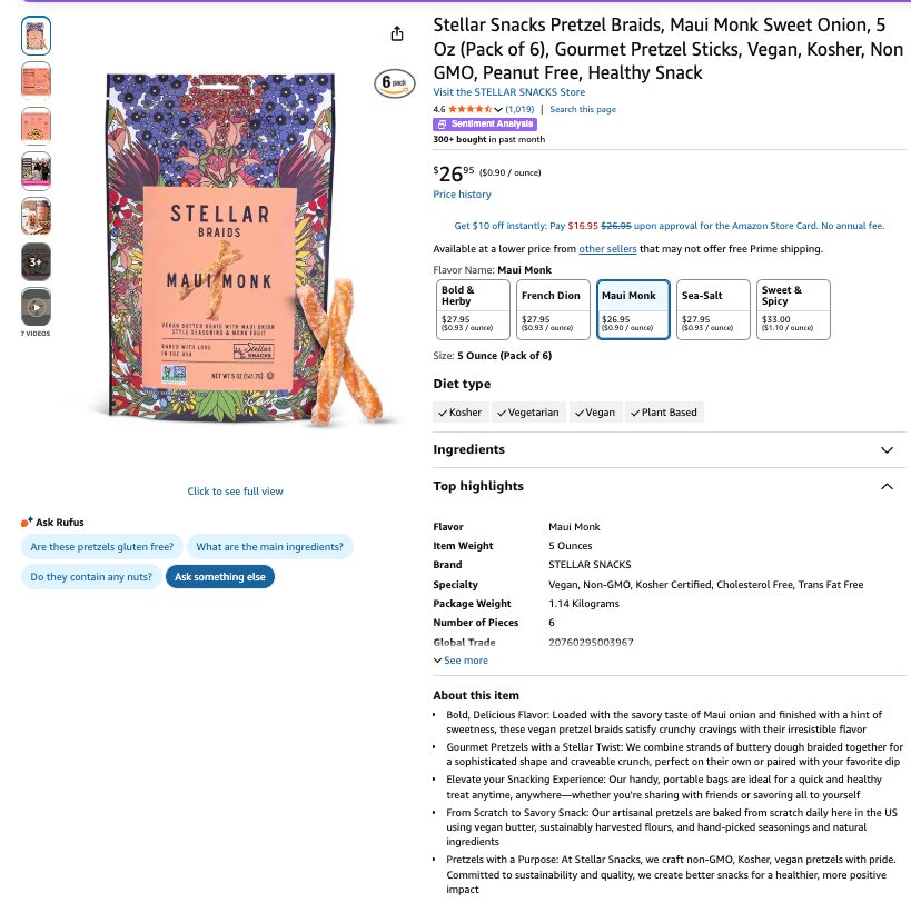 - We crafted a keyword-rich product title and benefit-driven bullet points that speak directly to the health-conscious snacker — highlighting vegan, non-GMO, and woman-owned credentials while weaving in search terms like “pretzel braids” and “healthy snack” that help Rufus surface the listing for the right queries.