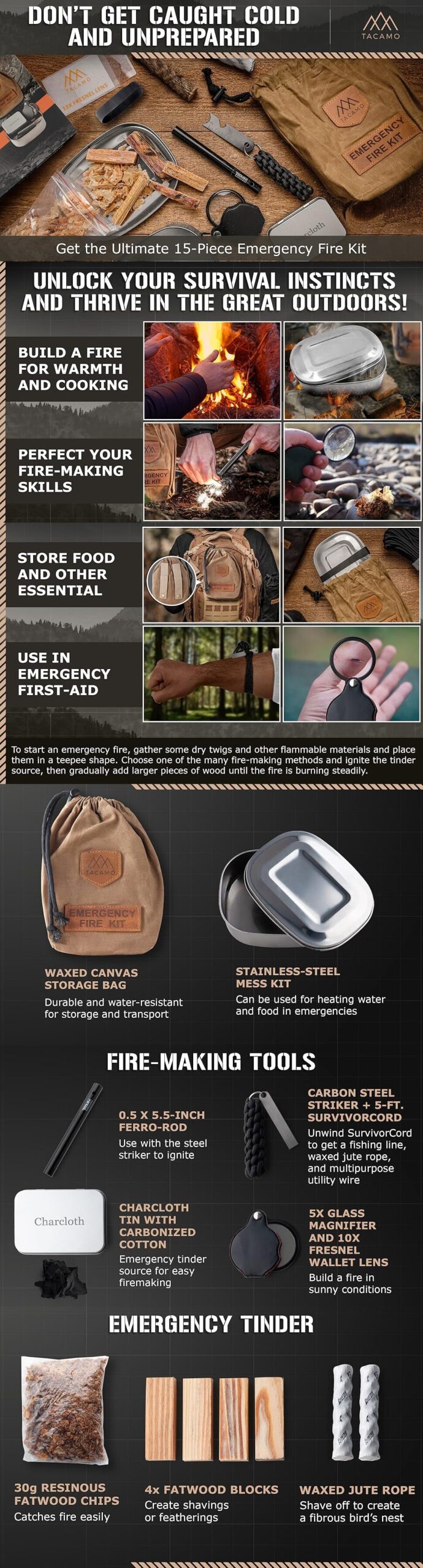 - A+ Content we created for TACAMO’s 15-Piece Emergency Fire Kit — featuring detailed product flat-lays, outdoor use-case panels, and component-level breakdowns of every item in the kit, giving shoppers (and Rufus) the depth that bullet points alone can’t deliver.