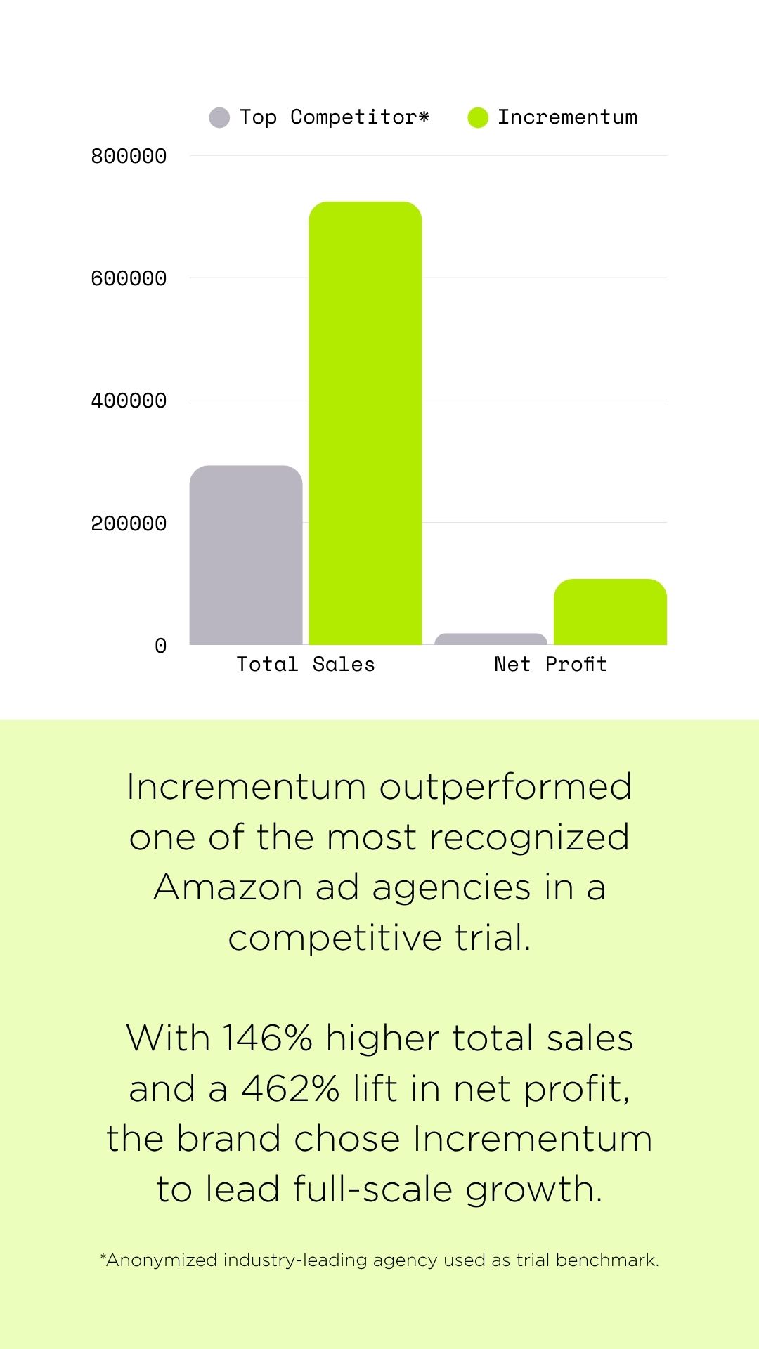 Multiple well-established agencies were invited to participate. While most focused narrowly on advertising performance, Incrementum stood out by structuring its strategy around total-account profitability. Rather than optimizing in silos, the team worked across core levers, from ad execution to catalog-level planning, to unlock both revenue and margin gains at scale.