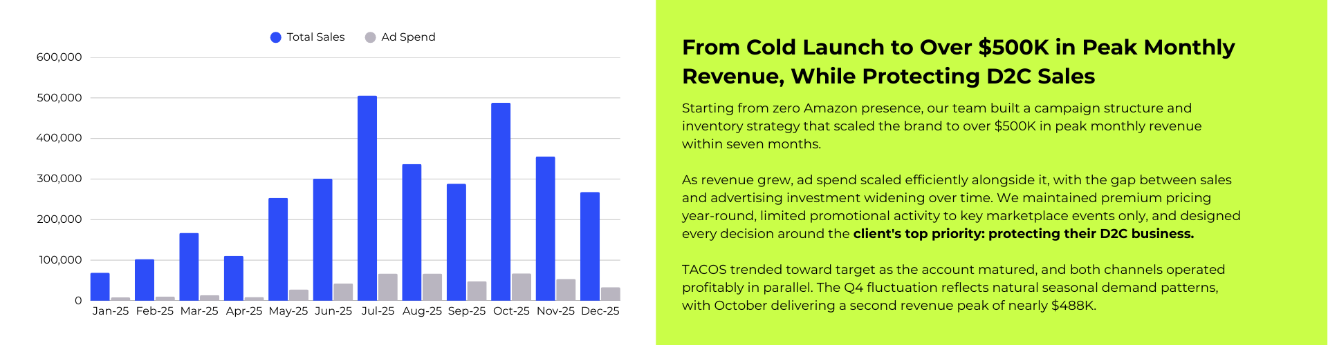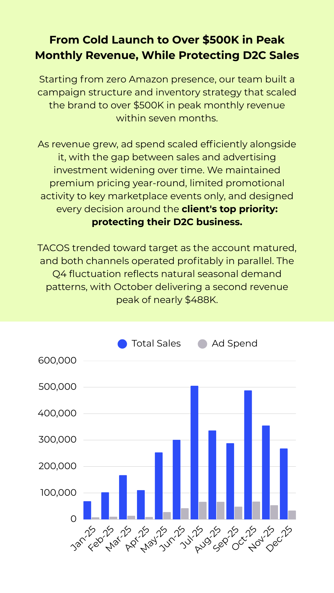 We designed a strategy that positioned Amazon and D2C as complementary, not competing, sales channels. We advised the brand to strengthen their website's value proposition, including free shipping, so that D2C retained its own advantages alongside Amazon's fulfillment speed. On the marketplace side, we maintained premium pricing year-round, limiting promotional activity to major tentpole events only. This meant neither channel undercut the other, and customers chose based on preference rather than chasing the lowest price. The result was a dual-channel framework that gave leadership confidence Amazon wouldn't erode what they had already built.