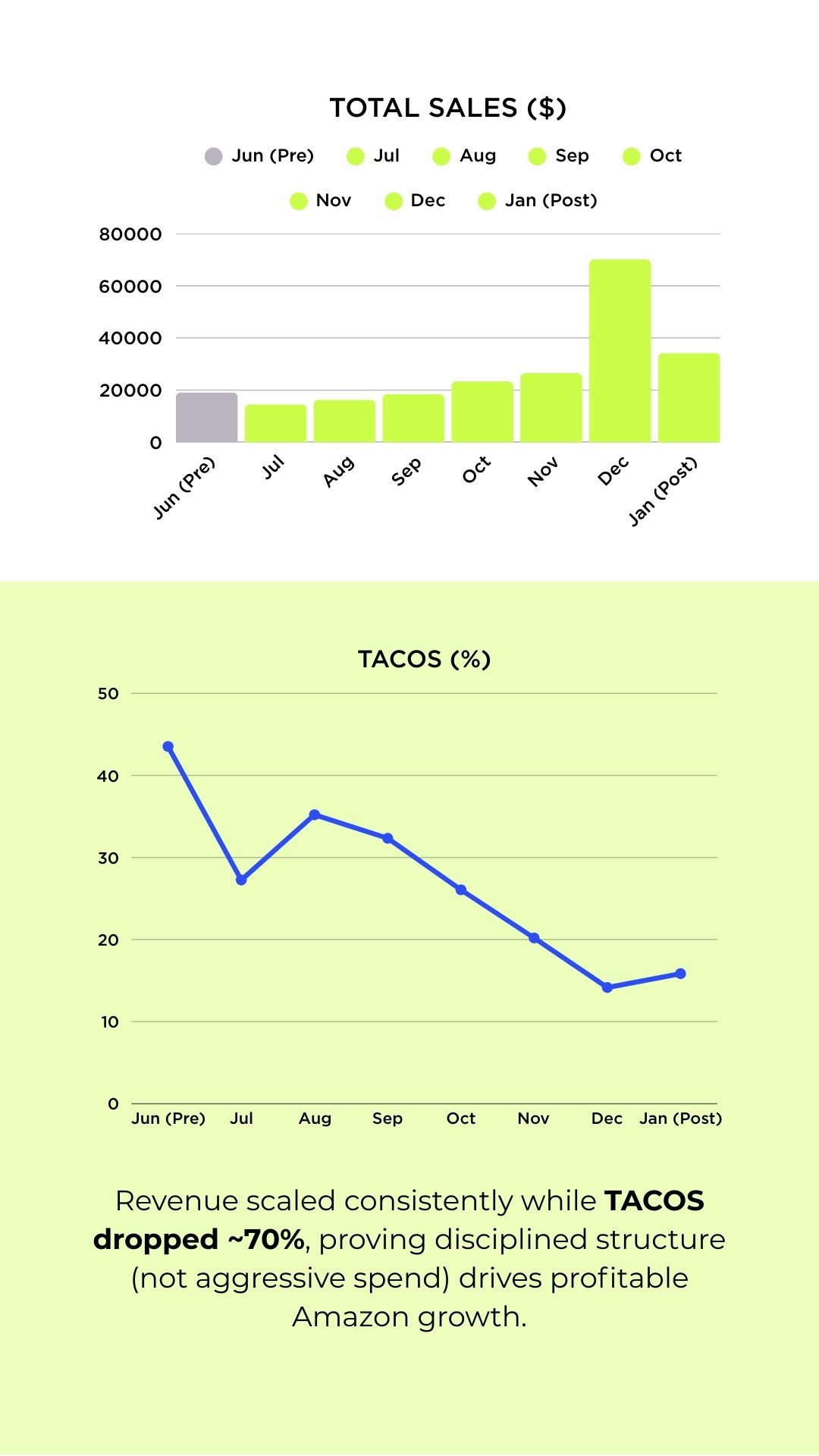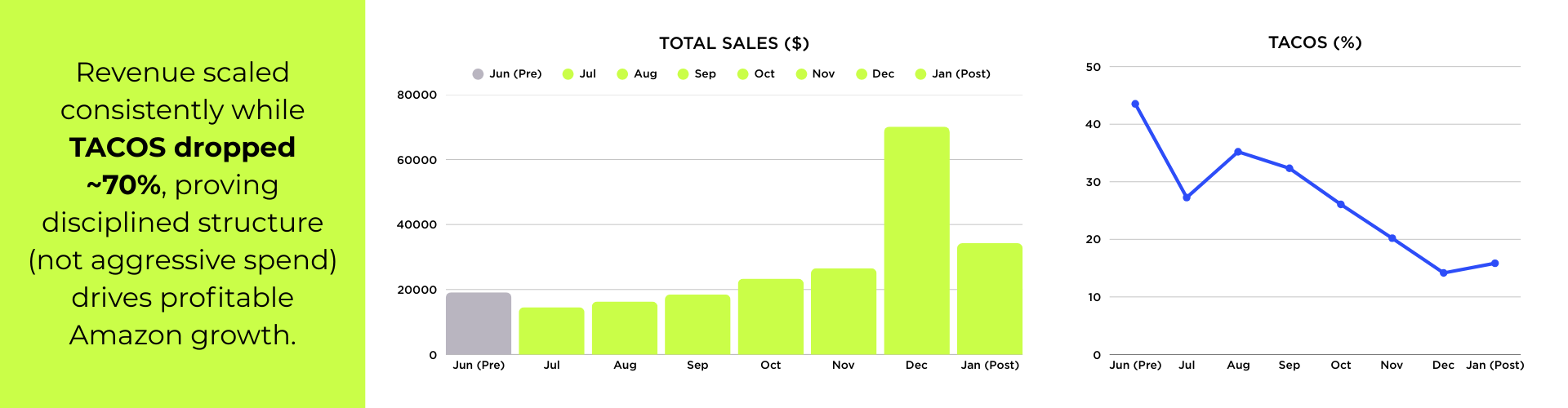 TACOS reduced by ~70%, dropping from 50%+ to ~15–20% while maintaining sales momentum